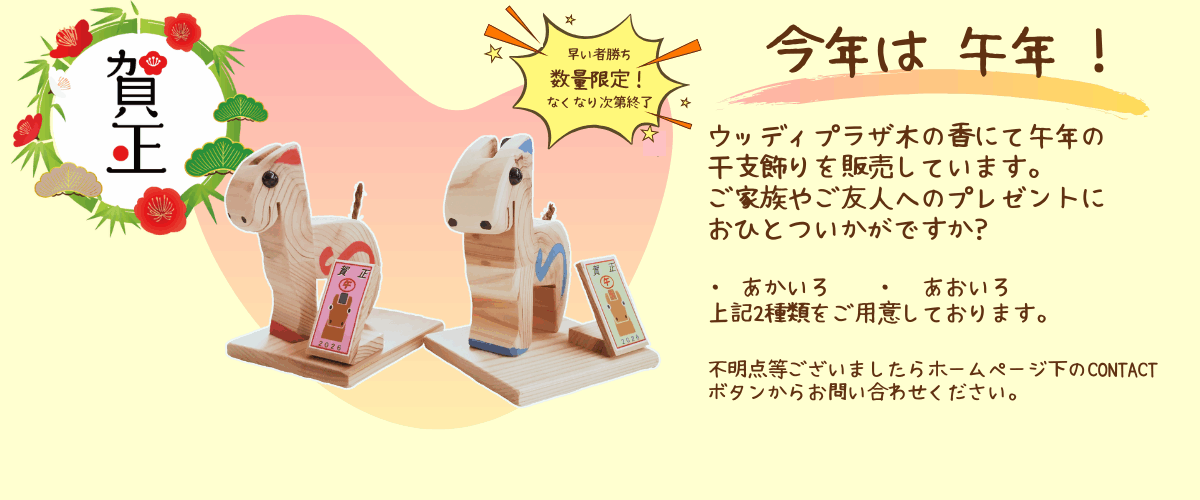 - 2023.12.27 【年末年始休業のお知らせ】 ウッディプラザ木の香は12月31日~1月3日まで、ウッディさんない事務所は12月31日~1月8日までお休みとさせていただきます。ご不便をお掛けし申し訳ございません。どうぞよろしくお願い致します。